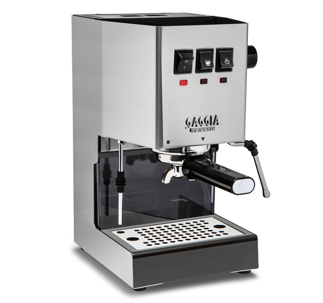 Simple rocker switches, a 2.1L water tank and cup warmer round out a user-friendly design. Paired with three filter baskets for ground coffee or pods, the Gaggia Classic E24 is perfect for everyday espresso at home.